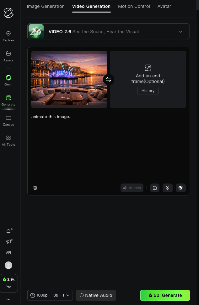 Third step, click on the Generate option in the left vertical menu, and insert your image and write your text prompt.